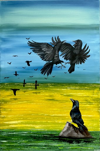 Der Farbverlauf am Himmel und die intensiven Farben vom Rapsfeld durchbrochen von schwarzen Raben.