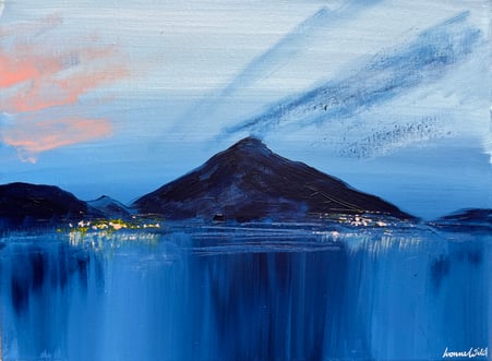 Hafen in Abendstimmung mit den ersten Lichtern, die am Ufer leuchten. Die Bergformation ist an keine bestimmte Region angelehnt und gibt deshalb viel Freiraum zum träumen.