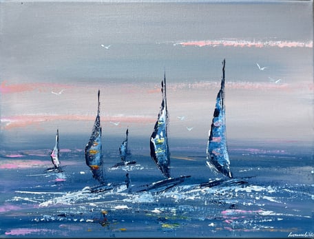 Inspiriert von all den wunderschönen Sonnenuntergängen am Zürichsee ist dieses Bild entstanden. 5 fahrende Segelboote.
